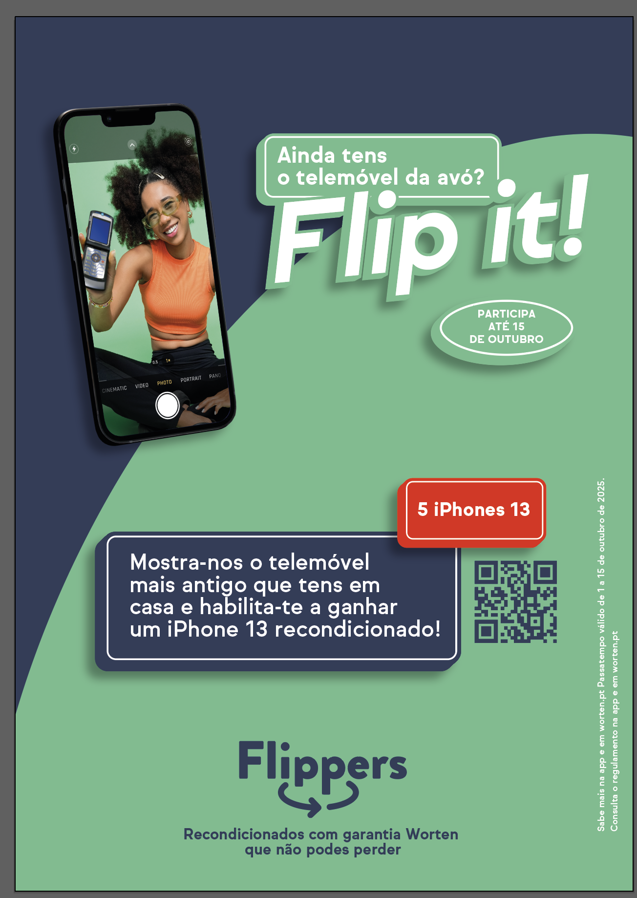 Flippers by Worten é a nova marca de recondicionados do universo Worten, que representa um ecossistema de equipamentos que abrangem categorias como smartphones, smartwatches, portáteis, tablets e consolas disponíveis no site, na app e nas lojas Worten. A marca posiciona-se como a escolha sustentável de referência para quem procura tecnologia de qualidade a preços acessíveis. Pensada especialmente para as novas gerações de consumidores, mais conscientes das questões ambientais, a marca destaca-se por oferecer vantagens como preços competitivos e garantias equivalentes às de equipamentos novos.